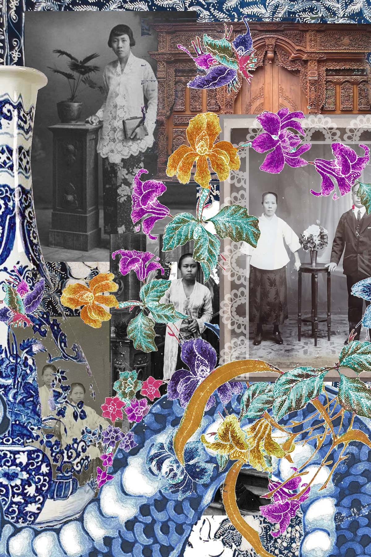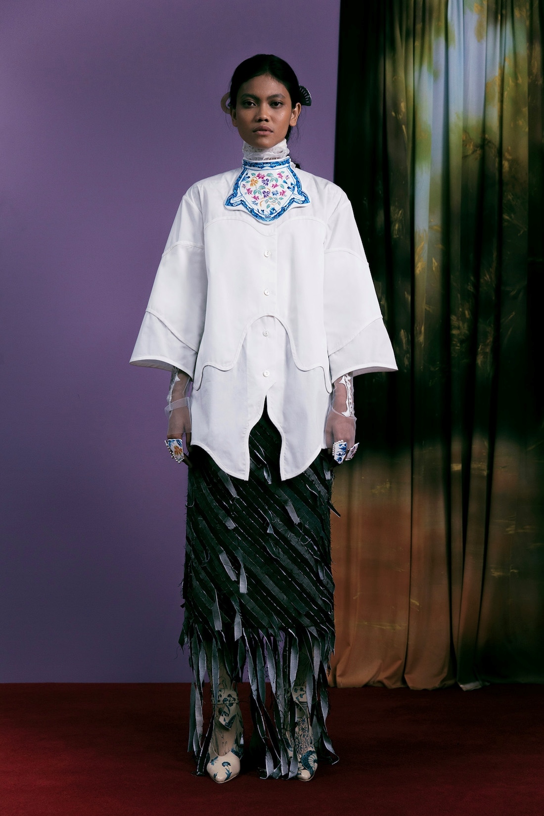 Inspired by batik biron and blue and white pottery our designer's late mother used to collect, the collection palette also informed the motifs that decorate the handmade accessories such as earrings, rings, paper clay body plates and hand-painted shoes.